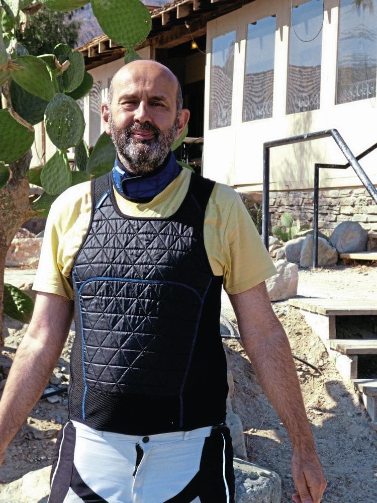 In those temperatures, it only lasts for about 40 minutes before needing recharging, but in less challenging conditions, Rev-it claims up to six hours. The vests are thin but stretchy so they fit snuggle under a jacket. We also had Rev’It cooling neck collars, which in Death Valley were also great… for about 20 minutes.