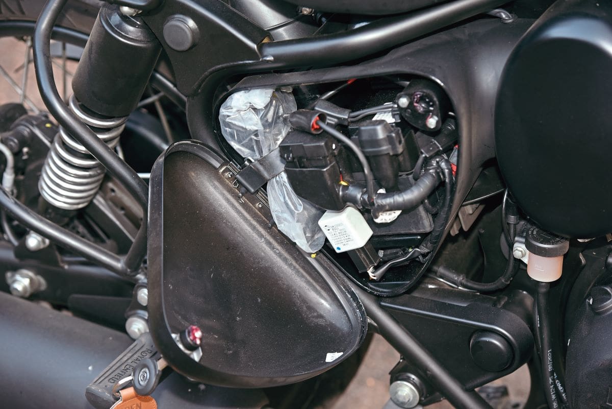 Differences seem minor but change the ride completely. The rear wheel is enlarged to 18in, with the front staying at 19in. The satnav and modern speedo have gone, making way for the traditional Enfield nacelle holding a classic-looking speedo, which hides two useful trip meters, a service and amusing ‘ECO’ sign, which comes up when you’re not hard on the throttle (oh wow, thanks for that, I wasn’t sure how much I’d twisted the throttle). Mudguards are larger, deeper and therefore more classic in look, but also do a damn fine job of keep you and the bike clean. The side panels have been changed; still do the same job hiding electrics and holding a decent toolkit, but on the Classic they mimic the triangular ones of days past. Oh, and the exhaust is slightly different. The large changes are the lower handlebars, the higher, two-piece seat and the footrests further back, giving a more traditional riding position. At 805mm, the seat is low enough for most, and boy, is it comfortable. Triumph, take note how to make a comfortable seat.