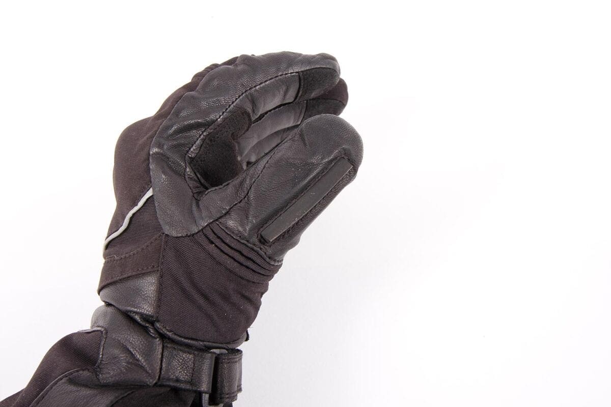 The gloves have a 40g Thinsulate lining on the palm, and 120g on the top, along with a supple nappa leather and nylon construction, and grippy ‘Chamude’ artificial leather also on the palm and finger tips for better grip. The knuckles are armoured, but in a nice, subtle style, and there are reflective patches and piping across the tops. It’s great to see a visor wipe on the left thumb, as well as a secure wrist restraint.